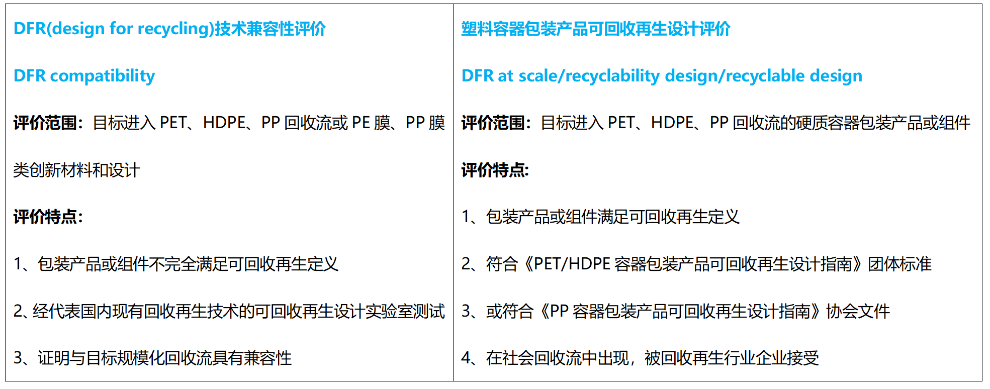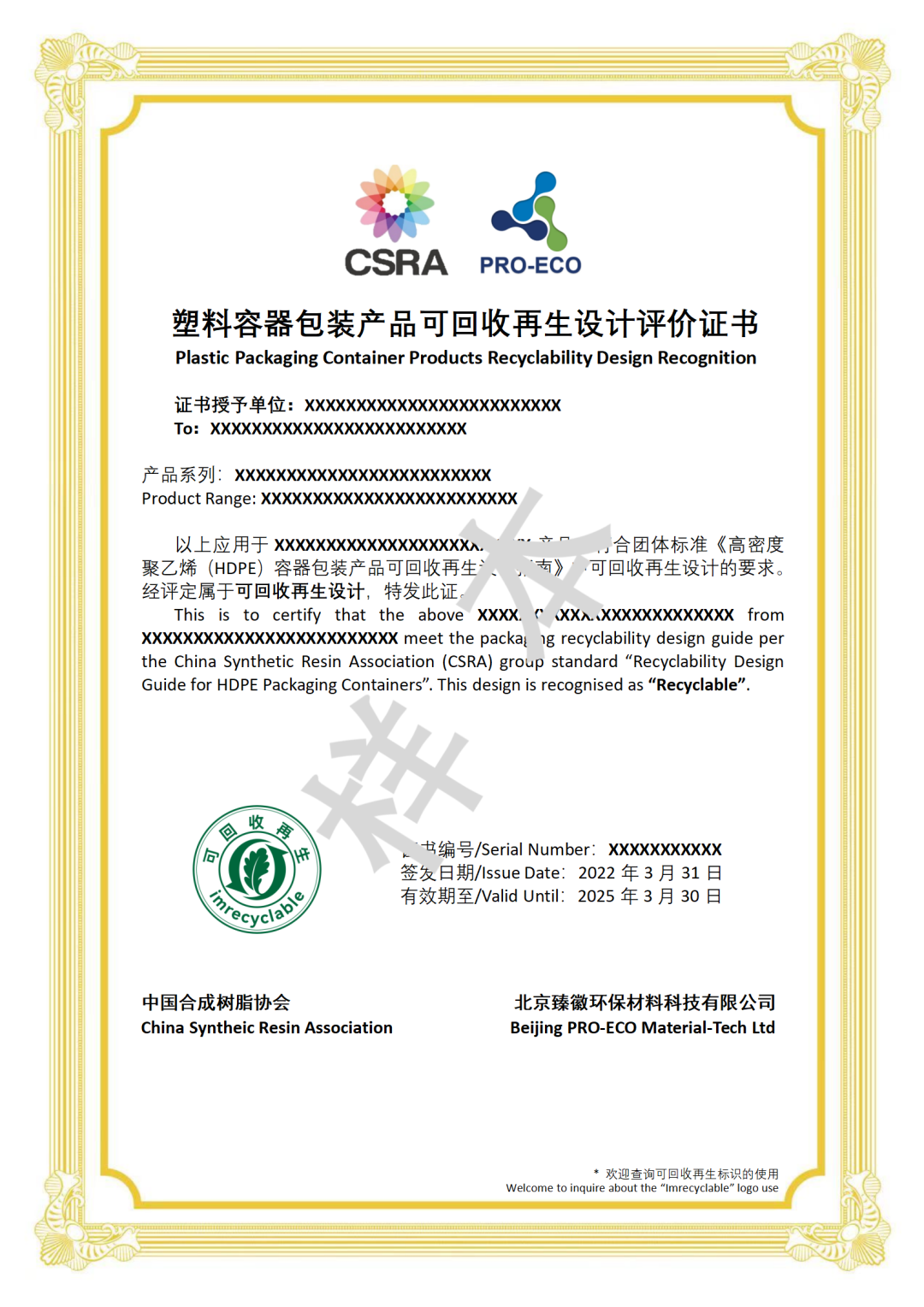 2022 márciusában a Kínai Szintetikus Gyanta Szövetség csoportja szabványokat fogadott el: „Tervezési útmutató a polietilén-tereftalát (PET) tárolóedények és csomagolótermékek újrahasznosításához és újrahasznosításához” és „Tervezési útmutató a nagy sűrűségű polietilén (HDPE) tárolóedények és csomagolótermékek újrahasznosításához és újrahasznosításához”. Hivatalosan is megjelent a "Műanyag konténeres csomagolótermékek újrahasznosítható tervezésének értékelése" és kiadta az értékelt terméktervezési esetek első tételét.